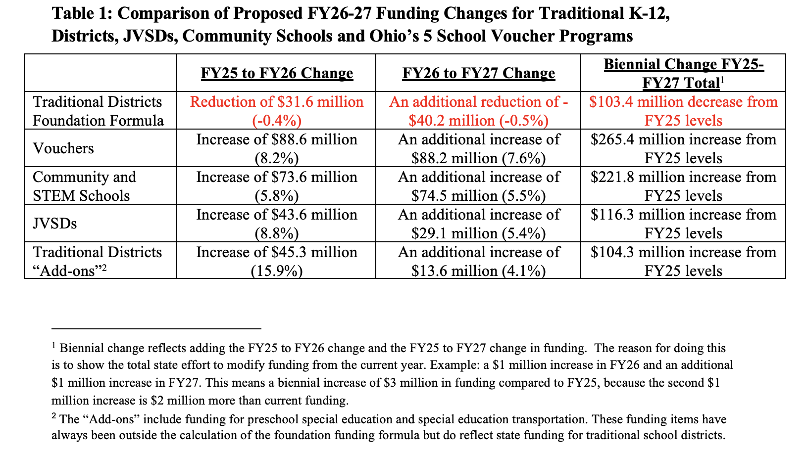 Table 1 provides a comparison of the impact of the Executive proposal on Ohio’s 609 traditional K-12 school districts, 49 JVSDs, 300+ community schools, and the state’s 5 school voucher programs.